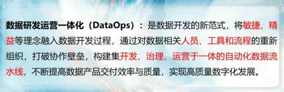 DataOps是一種面向流程的自動(dòng)化的數(shù)據(jù)分析與管理方法,它通過(guò)敏捷、自動(dòng)化、DevOps和數(shù)據(jù)管理等推動(dòng),目的在于提高數(shù)據(jù)質(zhì)量、數(shù)據(jù)分析效率、自動(dòng)化水平,強(qiáng)調(diào)跨部門協(xié)作、快速迭代、持續(xù)改進(jìn),幫助企業(yè)快速?zèng)Q策。