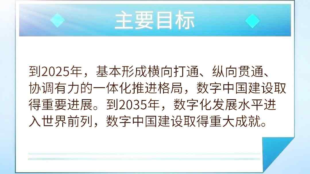 《規(guī)劃》中提到數(shù)字中國建設(shè)的目標(biāo)是:到2025年基本實(shí)現(xiàn)橫向打通、縱向貫通、協(xié)調(diào)有力的一體化推進(jìn)格局,取得階段重要進(jìn)展。到2035年數(shù)字化發(fā)展水平進(jìn)去世界前列,建設(shè)取得重大成就。