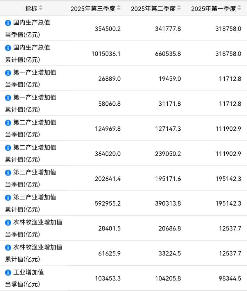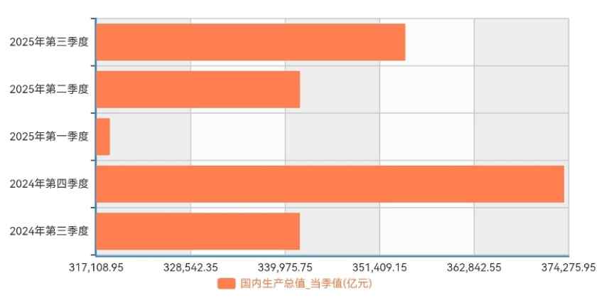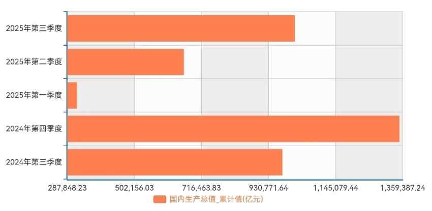 截至2025年第三季度,國內(nèi)GDP總產(chǎn)值101.5萬億。并且每個(gè)季度的當(dāng)季產(chǎn)值呈上升趨勢,另外按照2024年第三季度和第四季度的對比,2025年第四季度,當(dāng)?shù)禺a(chǎn)值也有望創(chuàng)造新高。