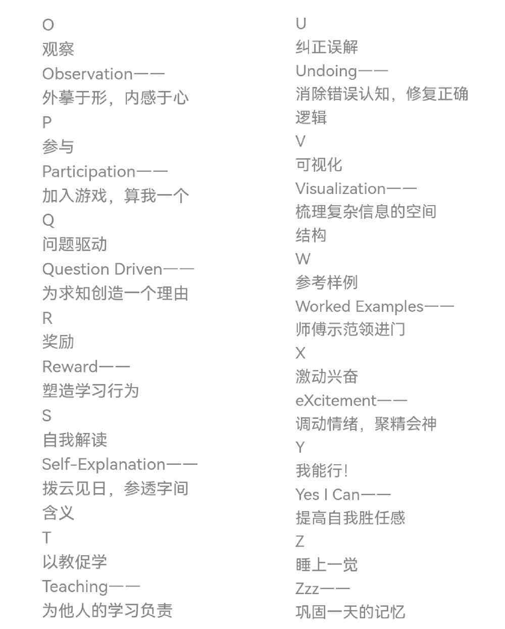 以及觀察-摹于形感于心、參與-加入游戲、問(wèn)題驅(qū)動(dòng)-驅(qū)動(dòng)求知、獎(jiǎng)勵(lì)-塑造形象、自我解讀-參透字間含義、以教促學(xué)-共同提升,糾正誤解-認(rèn)知正確邏輯、可視化-梳理空間結(jié)構(gòu)、參考樣例-示范和模仿、激動(dòng)興奮-高效學(xué)習(xí)、我能行-提高勝任感、睡上一覺(jué)-休息鞏固記憶!