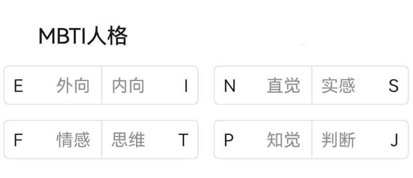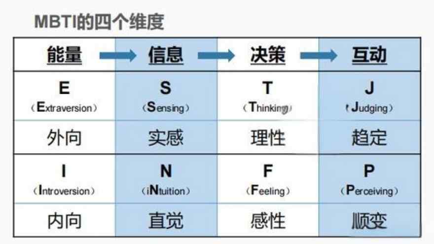 MBTI共有16種人格,這16種人格由4個(gè)維度構(gòu)成,分別為內(nèi)向與外向、直覺與實(shí)感、情感與思維、知覺與判斷,每一個(gè)維度有兩個(gè)字母,并且四個(gè)維度有先后順序分別為:E或I、N或S、F或T、P或J。