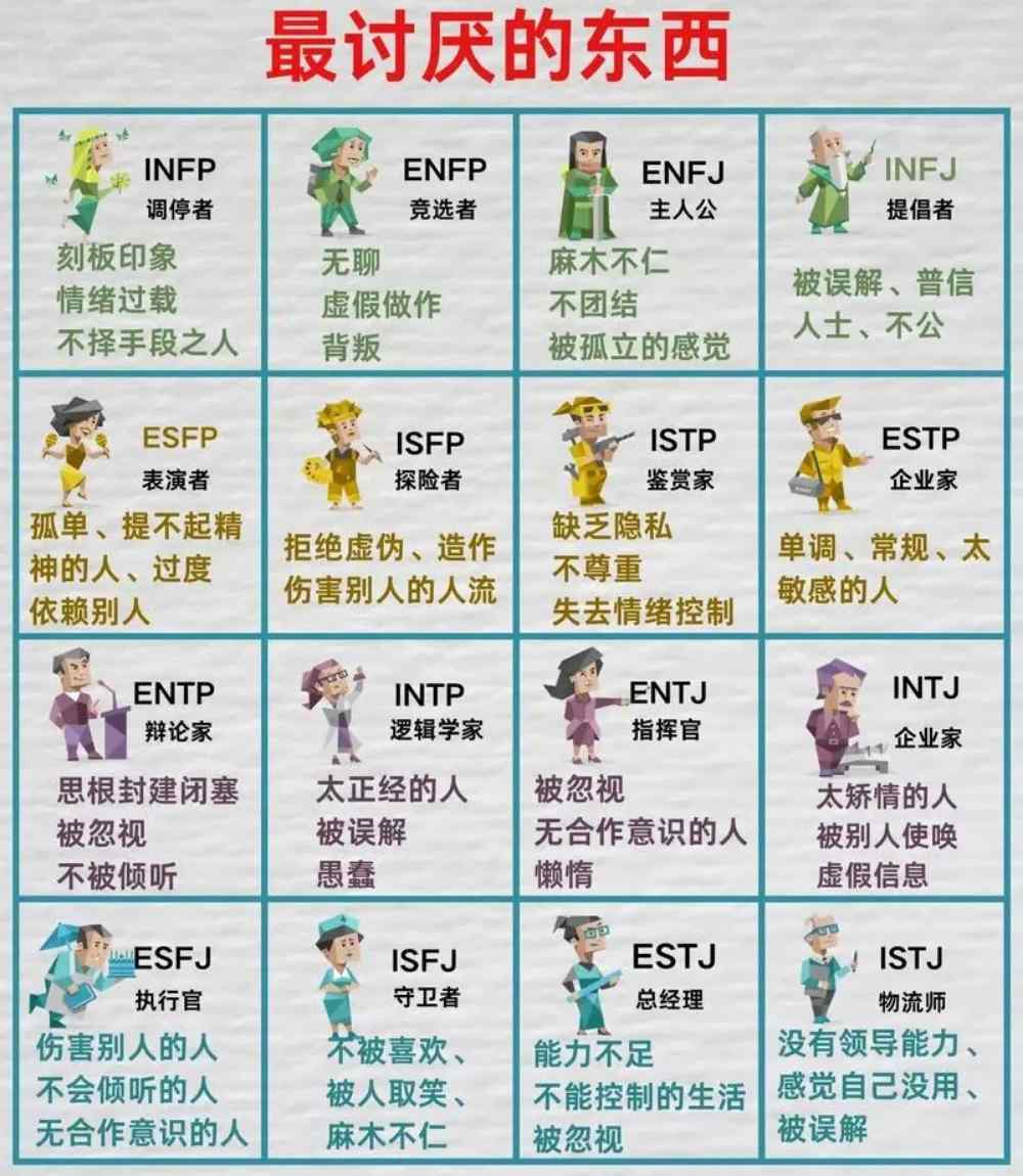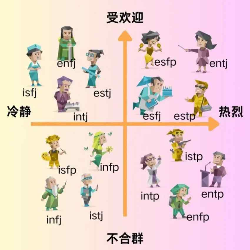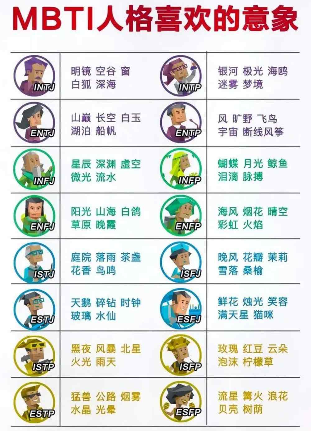 MBTI的16種人格:INTJ、INTP、ENTJ、ENTP、INFJ、INFP、ENFJ、ENFP、ISTJ、ISFJ、ESTJ、ESFJ、ISTP、ISFP、ESTP、ESFP