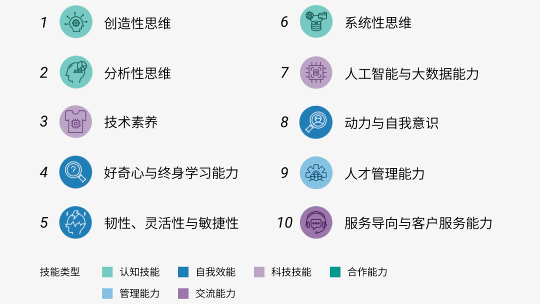 未來(lái)五年最需要培養(yǎng)的十項(xiàng)技能:包括創(chuàng)造性思維,分析性思維,技術(shù)素養(yǎng),好奇心與終身學(xué)習(xí)能力,韌性、靈活性與敏捷性,系統(tǒng)性思維,人工智能與大數(shù)據(jù)能力,動(dòng)力與自我意識(shí),人才管理能力,服務(wù)導(dǎo)向與客戶服務(wù)能力。