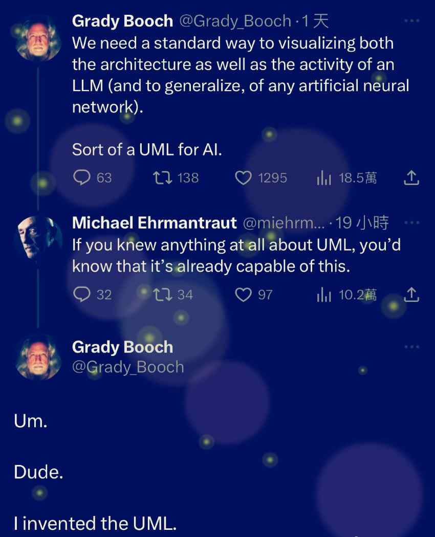 UML由Grady Booch、James Rumbaugh、Ivar Jacobson三人共同發(fā)明,下面是一個發(fā)明者Grady booch的段子。