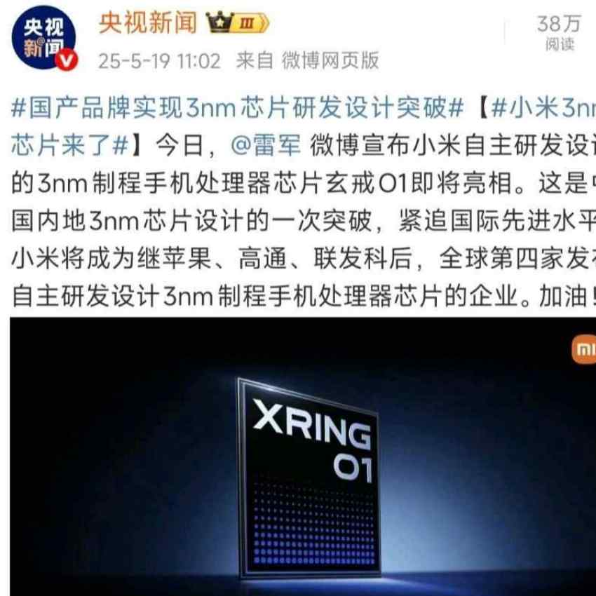 對(duì)小米本次要發(fā)布3nm制程的先進(jìn)芯片,央視新聞也進(jìn)行了轉(zhuǎn)發(fā)和表揚(yáng)。其中提到小米要發(fā)布的玄戒O13nm制程處理器,是國(guó)內(nèi)3nm芯片設(shè)計(jì)的一次突破,緊追國(guó)際先進(jìn)水平,小米公司將是全球第四家發(fā)布自主研發(fā)設(shè)計(jì)3nm制程手機(jī)處理器的企業(yè)。