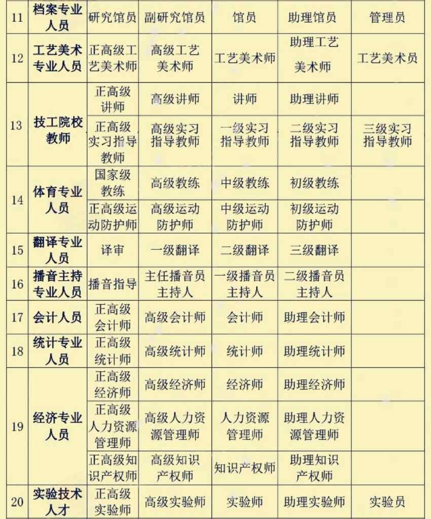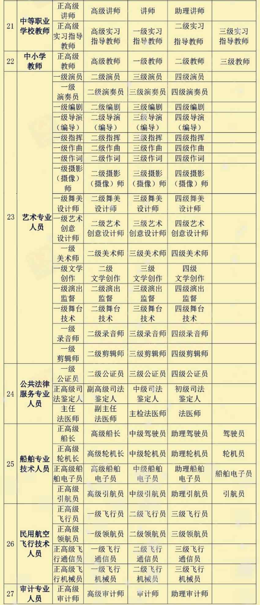 27個(gè)職稱系列或?qū)I(yè)及層級對應(yīng)如下: