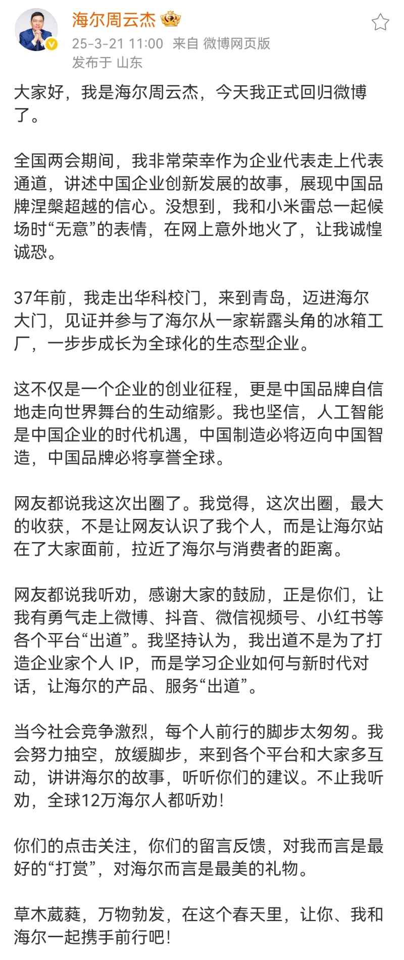 海爾周云杰在微博也打不了一篇長文,表達了他重返微博的激動之情:草木葳蕤,萬物勃發(fā),在這個春天里,讓你、我和海爾一起攜手前行吧!